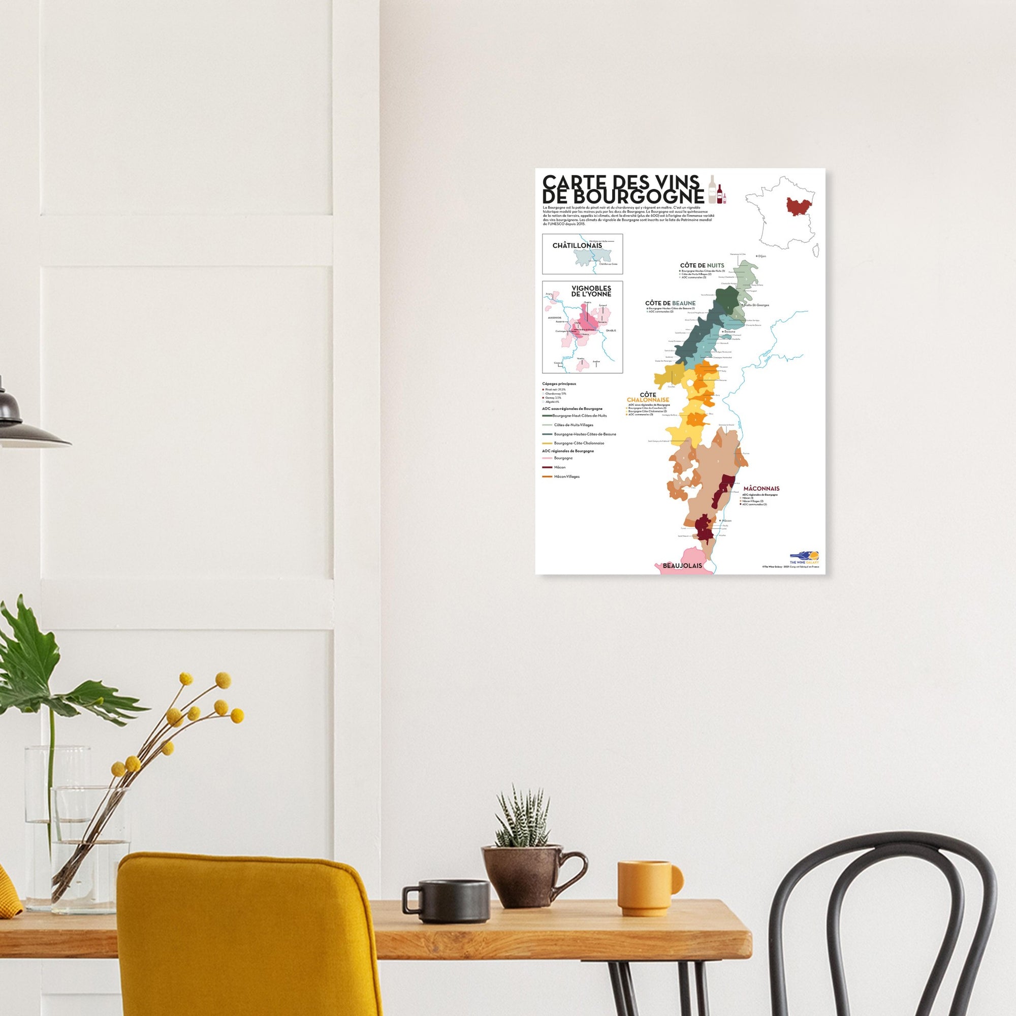 Les sommeliers, cavistes, établissements de restauration gastronomique et professionnels de l'hôtellerie trouveront cette carte de Bourgogne comme un ajout indispensable à leur établissement. Elle sert à la fois d'outil pédagogique et de décoration sophistiquée, aidant le personnel à expliquer pourquoi la Bourgogne atteint des prix premium et pourquoi les climats individuels au sein d'un même village peuvent varier considérablement. Lorsque les convives demandent la différence entre un vin de village et un Premier Cru, ou se demandent pourquoi la Bourgogne est si chère comparée à d'autres régions, cette carte fournit un contexte visuel instantané.